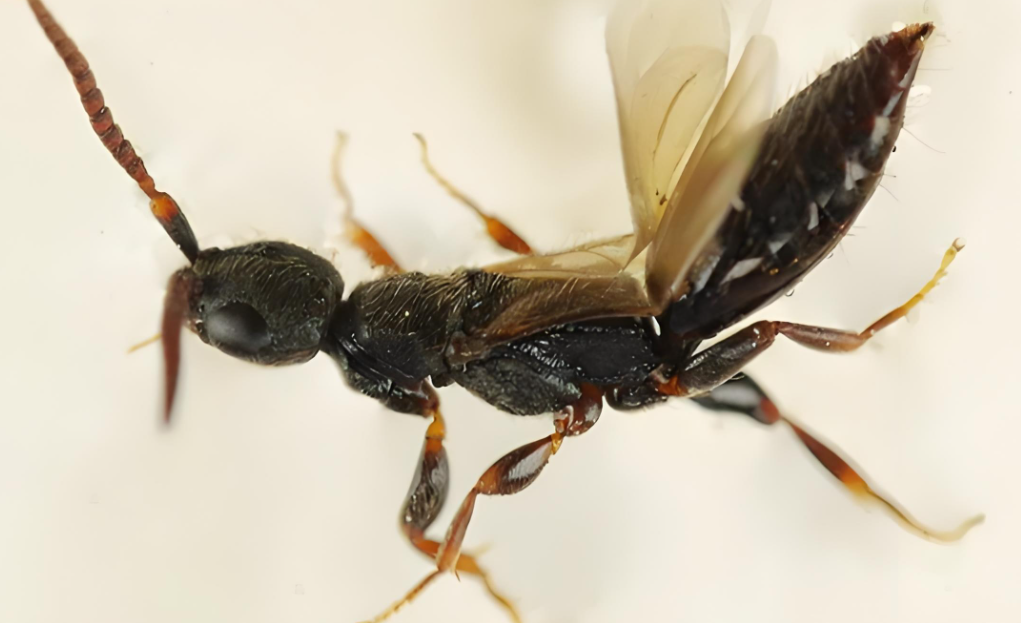 雌蜂體長3mn~4mm, 雄蜂體長2-3mm, 分無翅和 有翅兩型。頭、中胸、腹部及腿節(jié)膨大部分為黑色,后胸為深黃褐色;觸角、脛節(jié)末端及跗節(jié)為黃褐色: 頭扁平,長橢圓形,前口式;觸角13節(jié),基部兩節(jié) 及末節(jié)較長;前胸比頭部稍長,后胸逐漸收狹;前足腿節(jié)膨大呈紡錘形。 是天牛等多種蛀干害蟲的重要寄生性天敵,對于控制天牛危害具有重要作用。