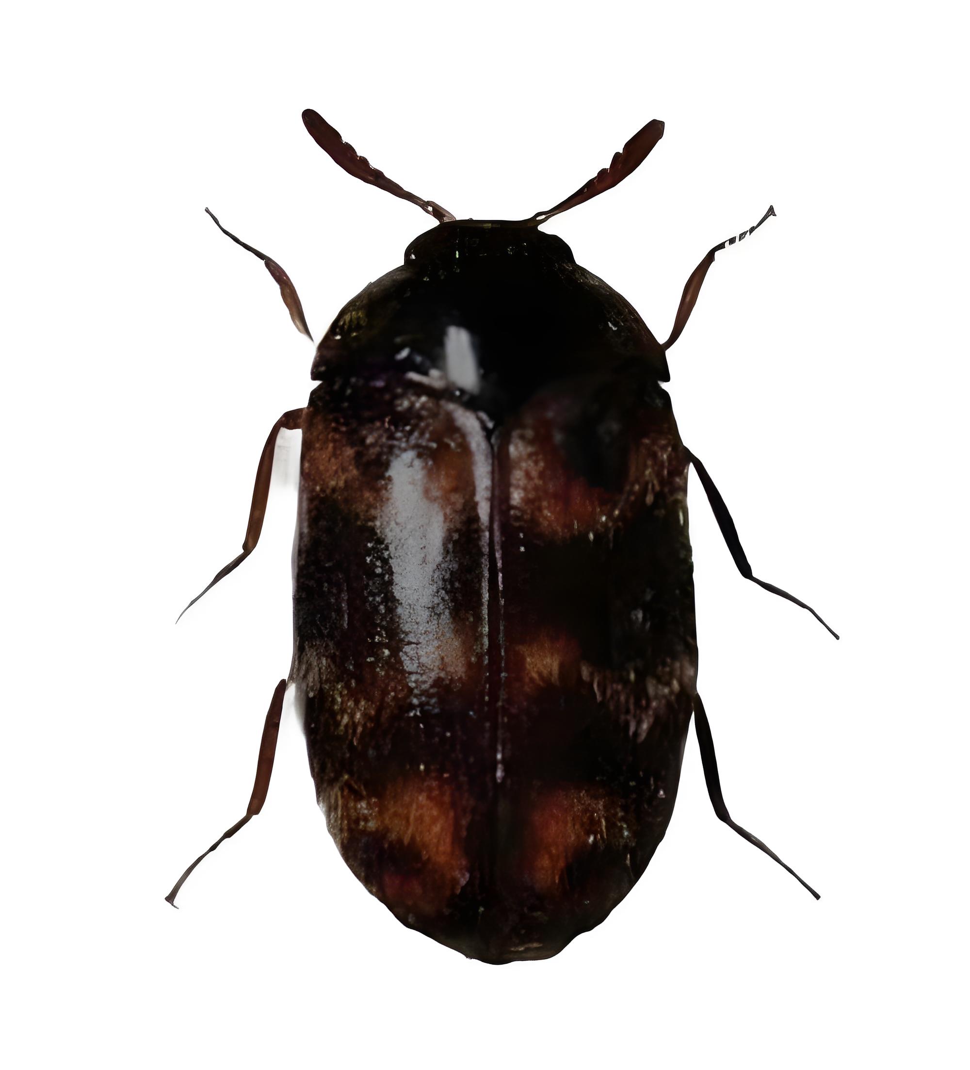 花斑皮蠹Trogoderma variabile 體長(zhǎng)約3毫米,卵圓形,赤褐色至深褐色,著生黃 褐色、白色細(xì)毛。觸角11節(jié),棒狀,棒節(jié)逐漸變粗, 長(zhǎng)可達(dá)前胸背板基部。