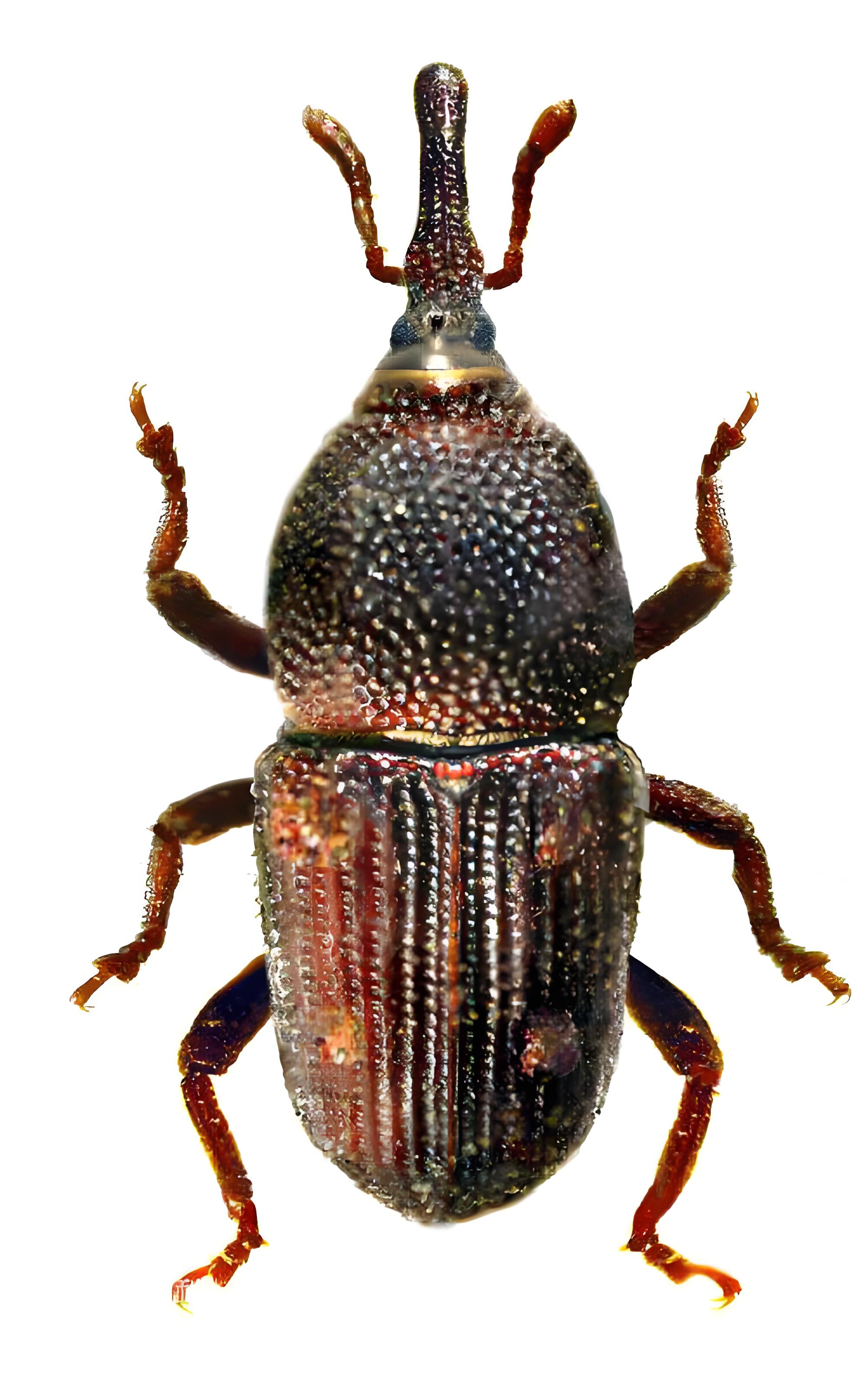 谷象Sitophilus granarius(L.) 體長(zhǎng)2 .4 — 2 .9mm,寬0 .9 — 1 . 5mm,體卵圓 形紅褐至瀝青色,背無(wú)光澤或略具光澤。