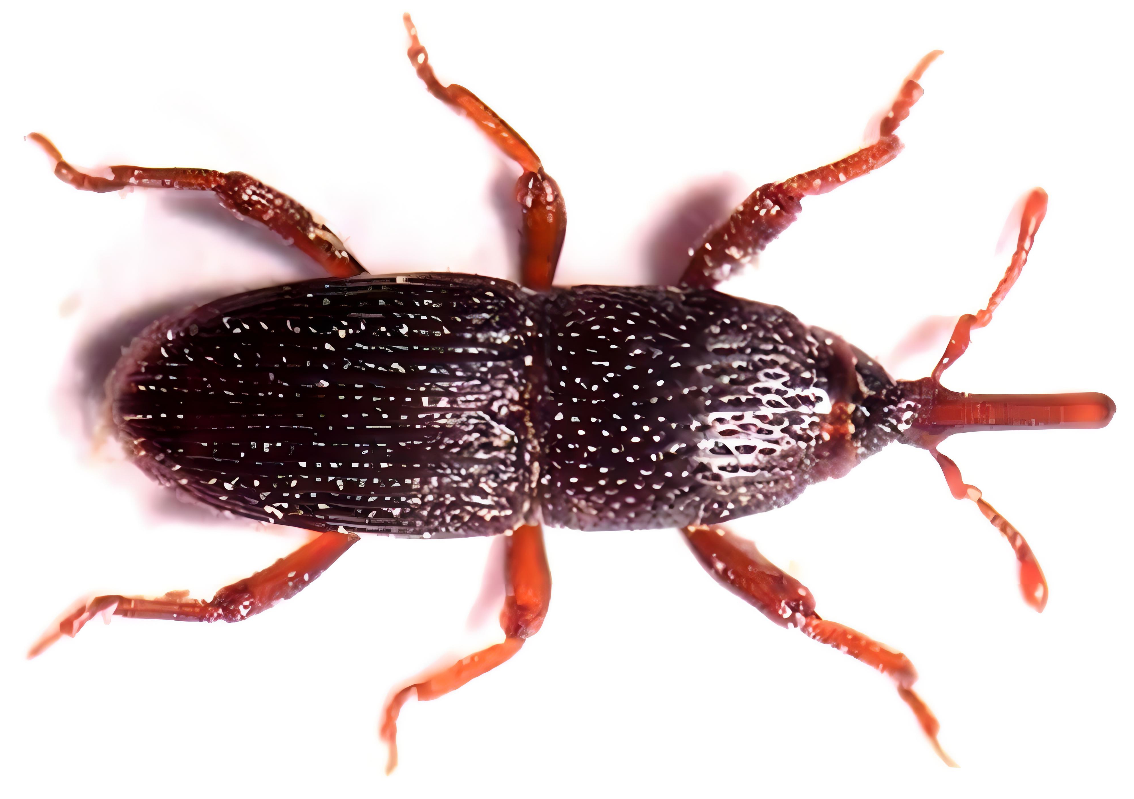 玉米象Sitophilus zeamais 體長(zhǎng)2.9~4.2毫米。體暗褐色,鞘翅常有4個(gè)橙紅色橢圓形斑。喙長(zhǎng),除端部外,密被細(xì)刻點(diǎn)。觸角位于喙基部之前,柄節(jié)長(zhǎng),索節(jié)6節(jié),觸角棒節(jié)間縫不明顯。前胸背板前端縮窄,后端約等于鞘翅之寬,背面刻點(diǎn)圓形,沿中線刻點(diǎn)多于20個(gè)。鞘翅行間窄于行紋刻點(diǎn)。前胸和鞘翅刻點(diǎn)上均有一短鱗毛。后翅 發(fā)達(dá),能飛。