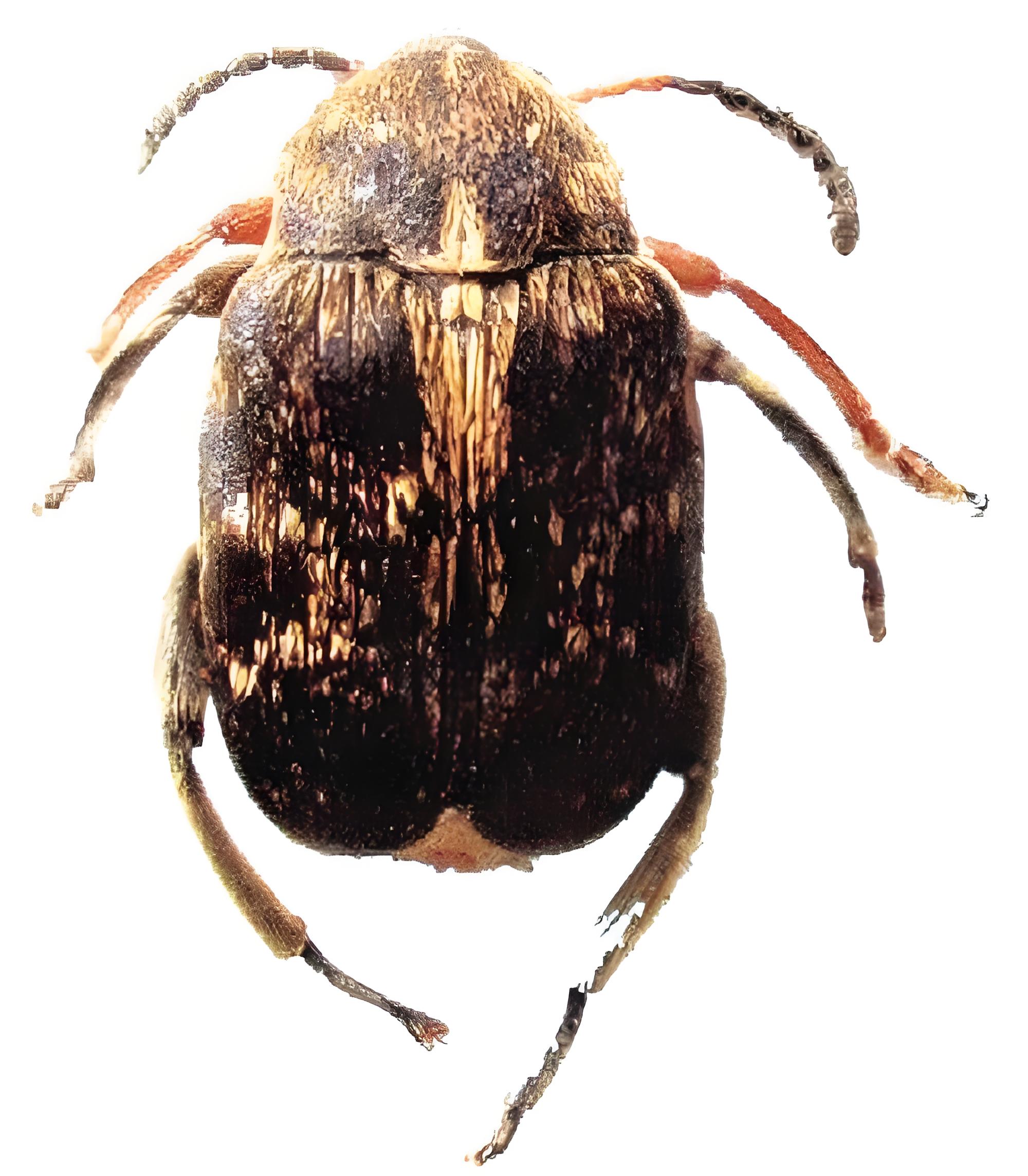 蠶豆象Broad bean weevil 體長4.5—5mm,橢圓形,灰褐色,蟲體密被絨毛;前胸背板后緣中央白毛斑皇三角形,兩側(cè)緣齒突 齒尖向兩側(cè)平行伸展;前足腿節(jié)大部分及脛節(jié),躕節(jié) 為赤褐色:兩鞘翅末端近1/3處的白毛斑皇狹長的雙 弧形;腹末臂板兩側(cè)黑斑不明顯,,白毛斑不皇“T 字型。后足腿節(jié)腹面內(nèi)緣齒突長而直。