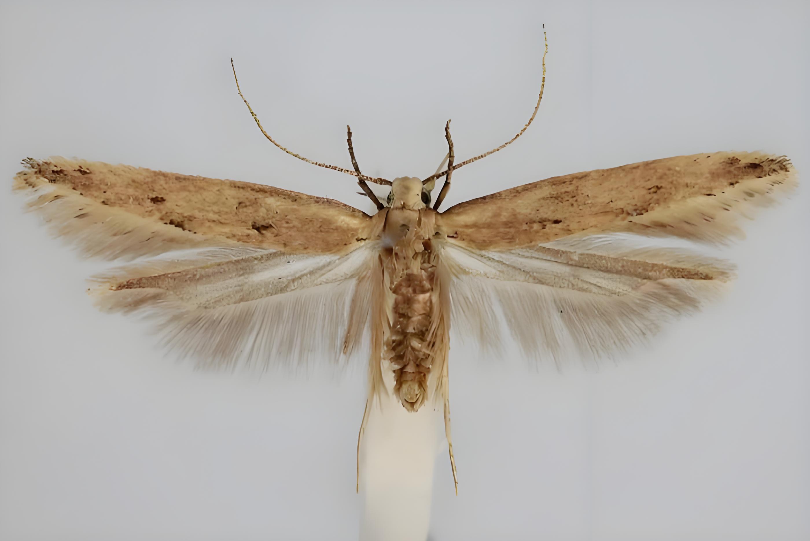 米織蛾(米淡墨蟲)Anchonomaxeraula Meyrick 成蟲體長10-12mm,翅展20-28mm。成熟幼蟲體長 22-23mm,寬2-2.5mm。前翅寬條形,翅頂橢圓,下唇 須尖長上舉,褐色,中小型的小蛾類昆蟲,幼蟲喜蛀食大米并吐絲綴糧食碎屑成巢。