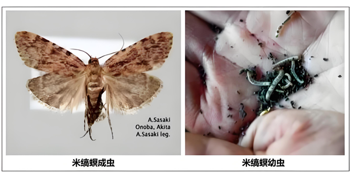 群集的幼蟲吐絲綴糧?;蛩樾汲沙?,潛伏在巢 中為害。