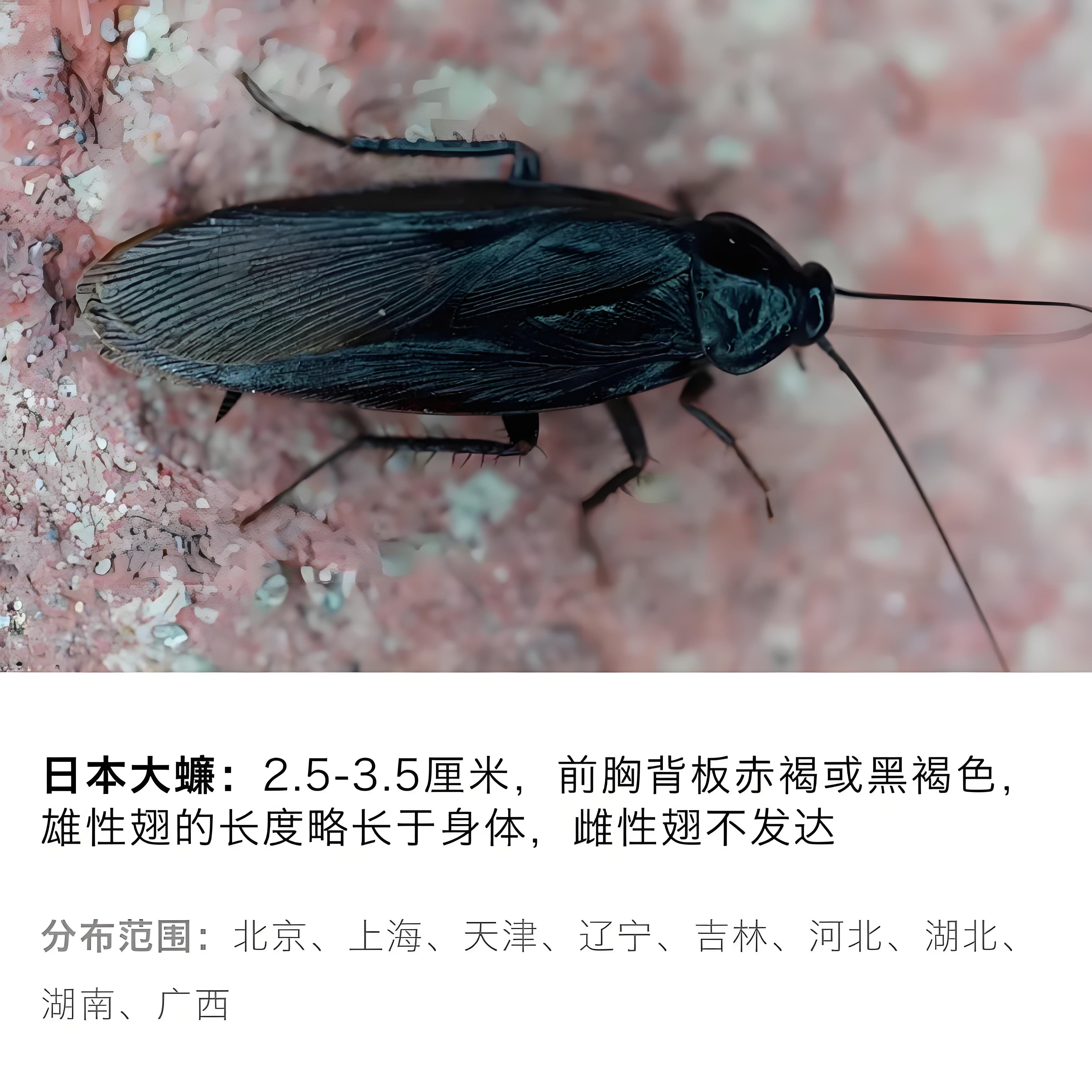 日本大蠊Periplaneta japonica,Karny 體長(zhǎng)20~25毫米,深褐至黑褐色,稍有光澤。雄蟲的前胸背板前窄后寬,略呈三角形,背面有不規(guī) 則的汪凹陷,雌蟲的寬大,中央具錨狀紋。雄蟲翅長(zhǎng),超過腹端;雌蟲的不發(fā)達(dá),僅伸達(dá)不到腹部之半。